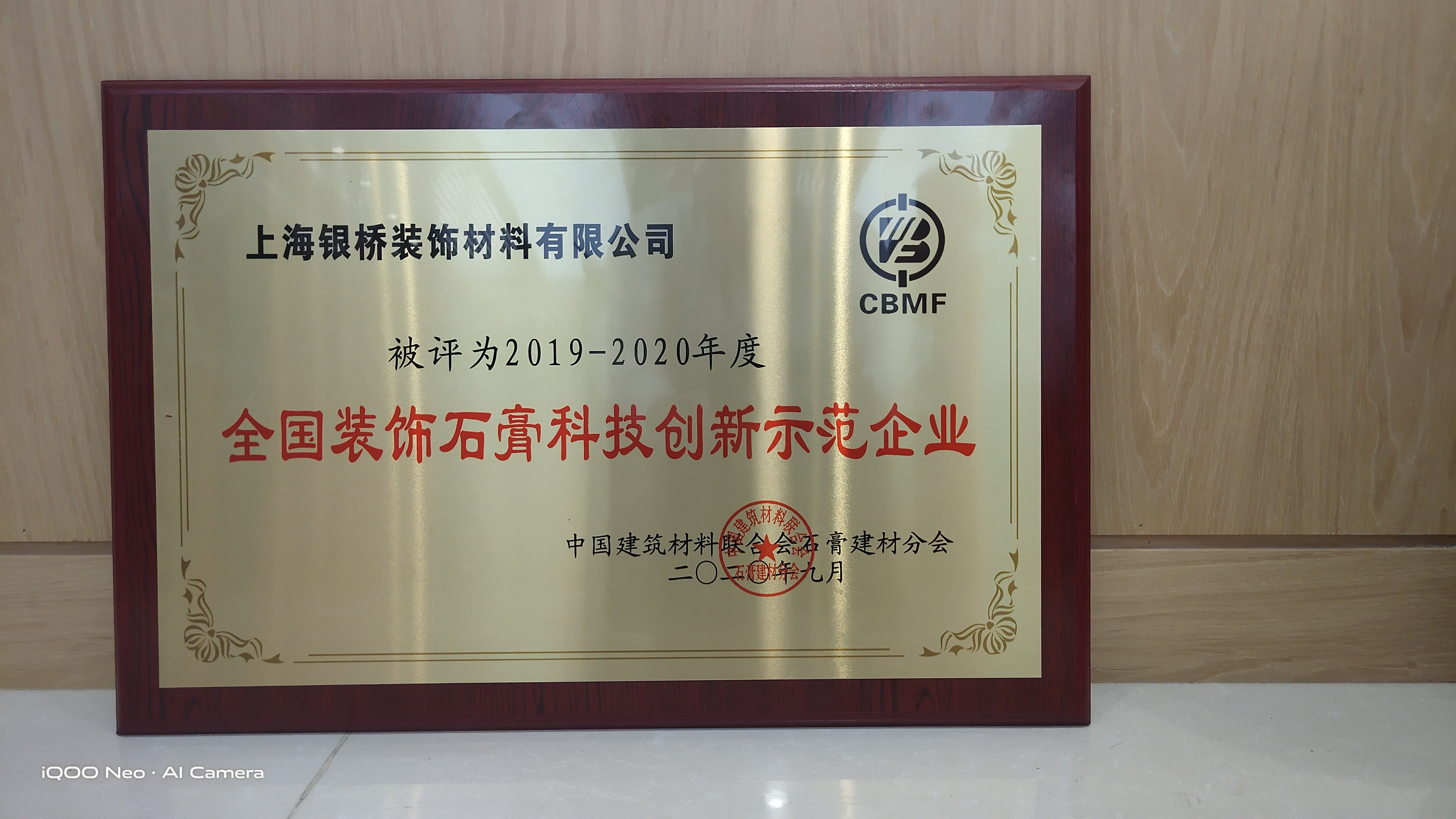 上海銀橋裝飾材料有限公司榮獲全國(guó)裝飾石膏科技創(chuàng)新示范企業(yè)